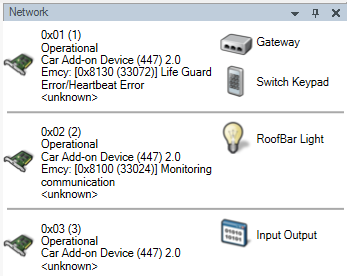 Diese Simulation ist eine Allzweckanwendung zur Steuerung bestimmter Arten von Knoten auf einem CiA447-Netzwerk (Car Add-On Devices). Zum Beispiel können alle Ein- und Ausgänge eines E/A-Moduls gesteuert werden, zusammen mit Blaulichtern, Dachbalken, Sirenen und anderen virtuellen Geräten.